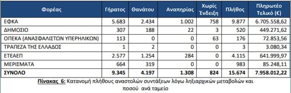 Επίσης, το μήνα Ιανουάριο διακόπηκαν (θάνατος, γάμος)15.674 συντάξεις συνολικού ποσού 7.958.012,22 από τις οποίες 4.115 ήταν επικουρικές (ΕΤΕΑΕΠ).