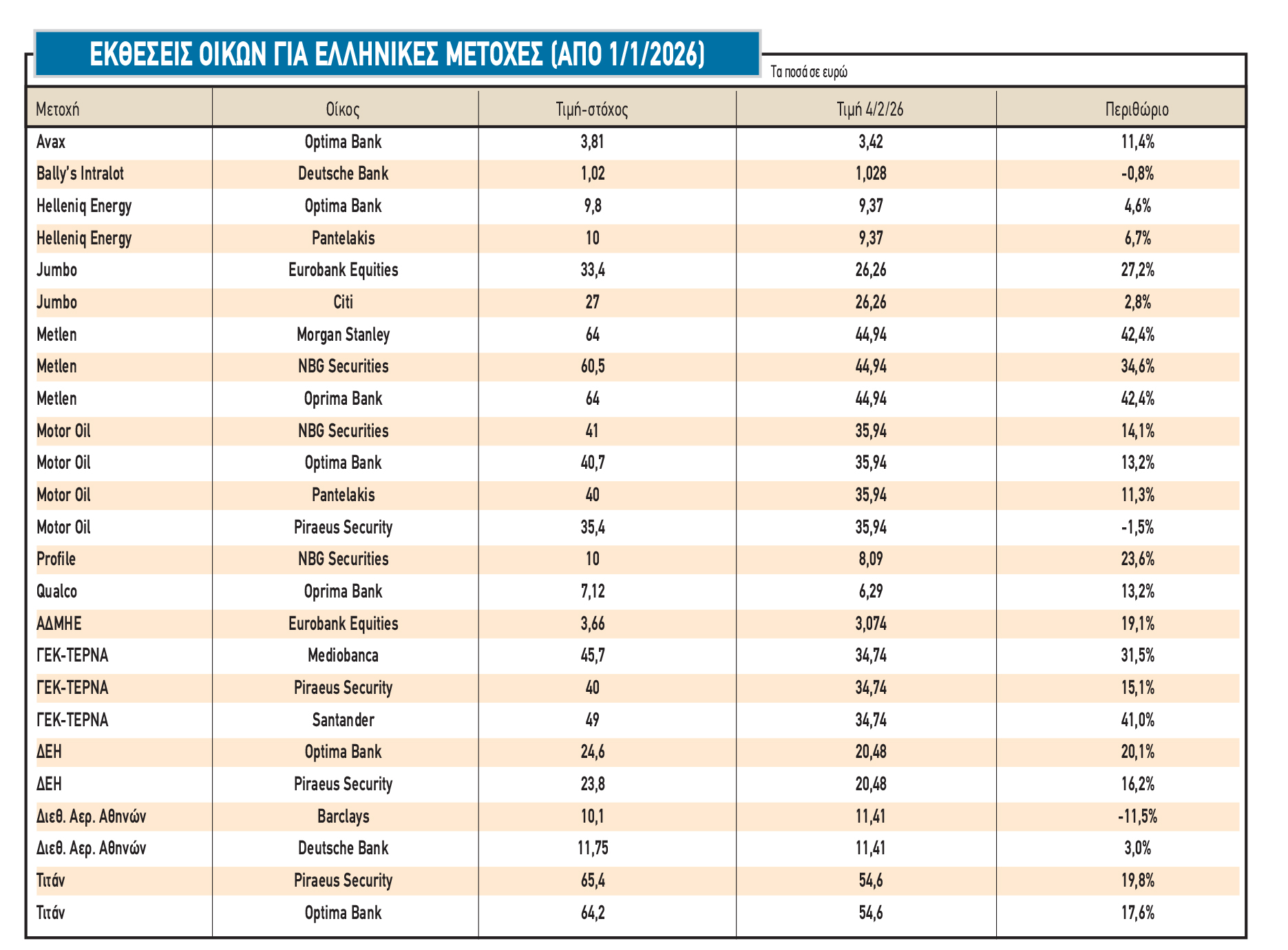 Δεν είναι τυχαίο ότι οι αναλυτές έχουν ανεβάσει κατακόρυφα τις τιμές-στόχους σε σχέση με πέρυσι (π.χ. Avax από τα 3,03 στα 3,81 ευρώ, Motor Oil από τα 28 στα 41 ευρώ, Profile από τα 6,7 στα 10 ευρώ, ΓΕΚ-ΤΕΡΝΑ από τα 27 στα 45-49 ευρώ, κ.λπ.).