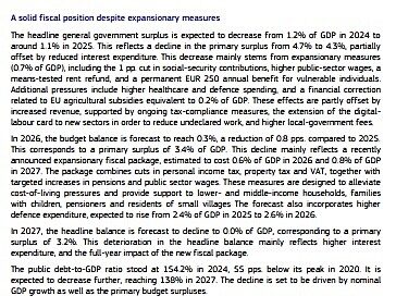 Για το 2027, η ΕΕ προβλέπει επιβράδυνση του ρυθμού στο 1,7%, εξέλιξη που αποδίδεται στη σταδιακή ολοκλήρωση των έργων του RRF. Παρ’ όλα αυτά, οι δημοσιονομικές προοπτικές της χώρας παραμένουν ισχυρές, με σταθερά πρωτογενή πλεονάσματα και συνεχή αποκλιμάκωση του δημόσιου χρέους, τόσο σε απόλυτα μεγέθη όσο και ως ποσοστό του ΑΕΠ.