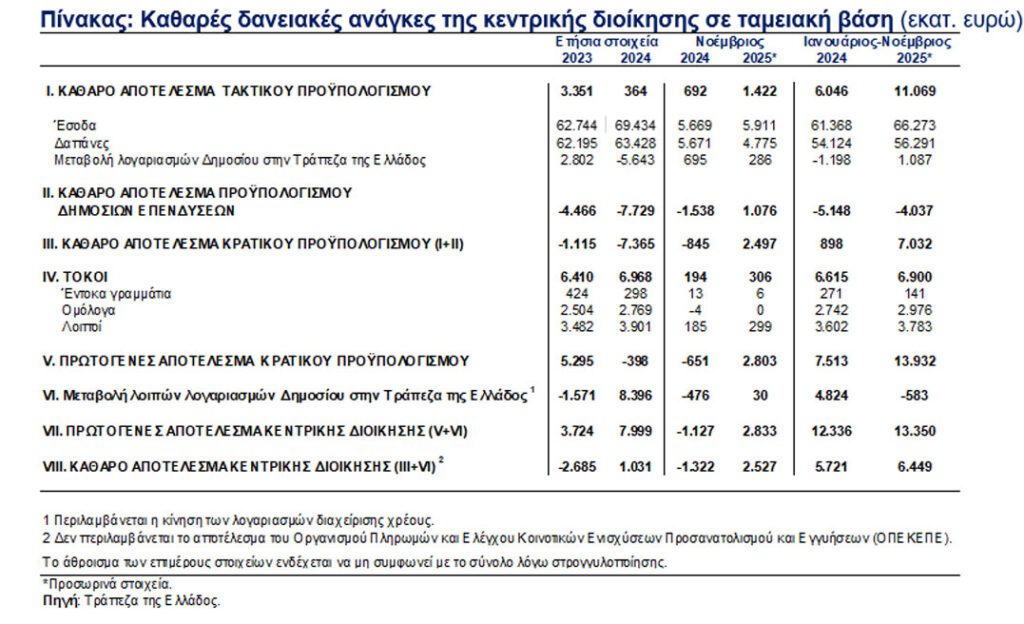 Την περίοδο Ιανουαρίου-Νοεμβρίου 2025, το ταμειακό αποτέλεσμα της κεντρικής διοίκησης παρουσίασε πλεόνασμα 6.449 εκατ. ευρώ, έναντι πλεονάσματος 5.721 εκατ. ευρώ την αντίστοιχη περίοδο του 2024.