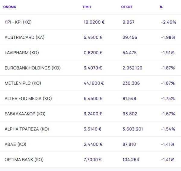 Οι μετοχές με τη μεγαλύτερη πτώση ήταν: