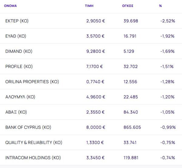 Οι μετοχές με τη μεγαλύτερη πτώση ήταν:
