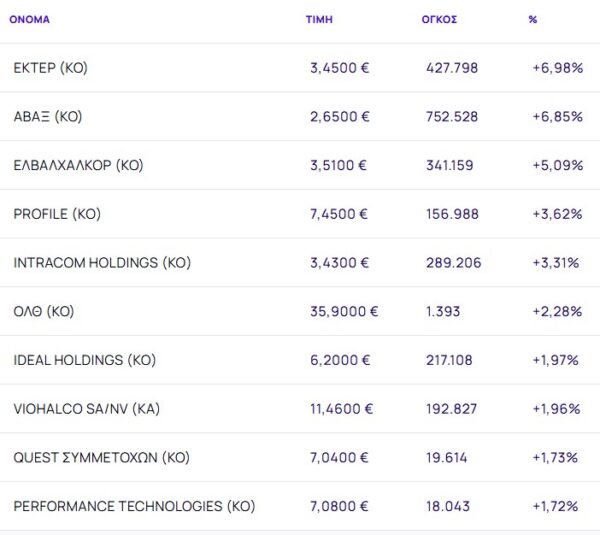 Οι μετοχές με τη μεγαλύτερη άνοδο ήταν:
