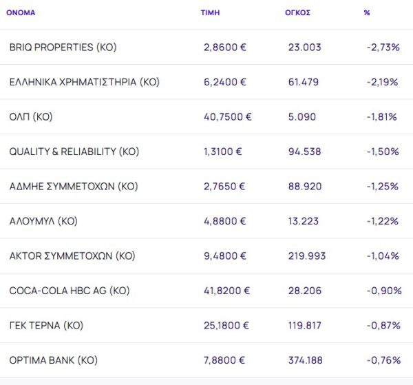 Οι μετοχές με τη μεγαλύτερη πτώση ήταν: