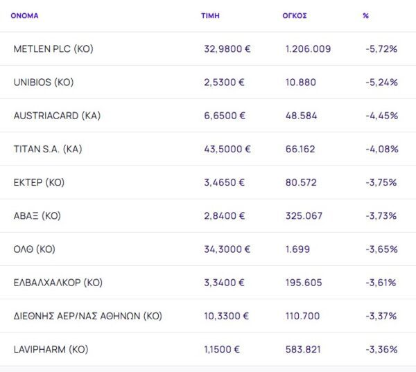 Οι μετοχές με τη μεγαλύτερη πτώση ήταν: