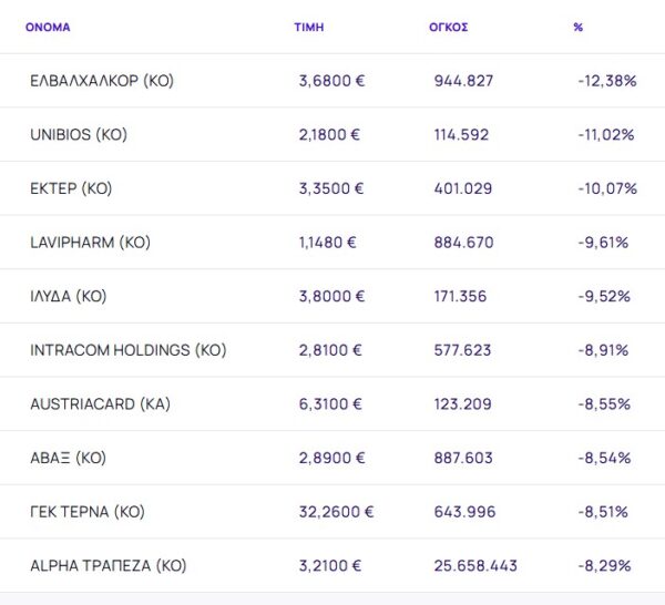 Οι μετοχές με τη μεγαλύτερη πτώση ήταν: