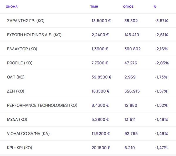 Οι μετοχές με τη μεγαλύτερη πτώση ήταν: