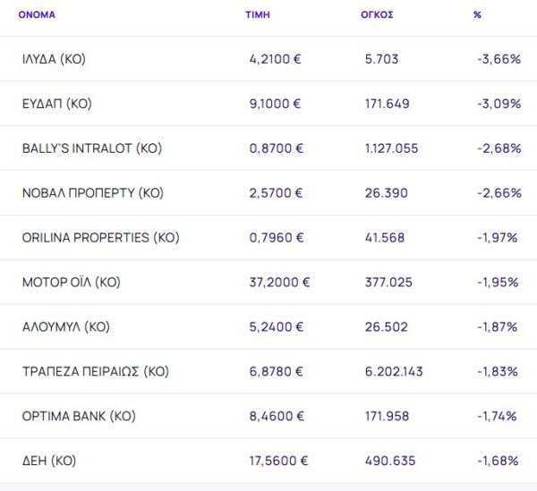 Οι μετοχές με τη μεγαλύτερη πτώση ήταν: