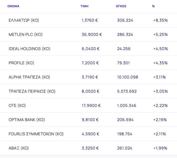 Οι μετοχές με τη μεγαλύτερη άνοδο ήταν: