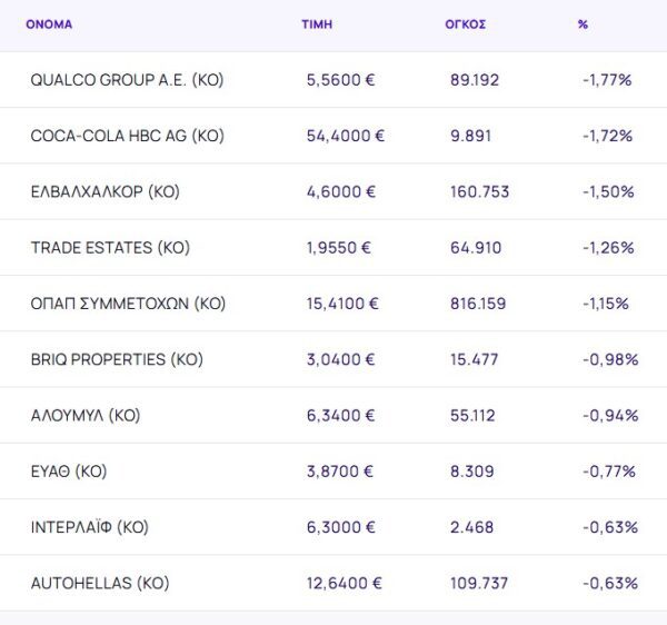Οι μετοχές με τη μεγαλύτερη πτώση ήταν:
