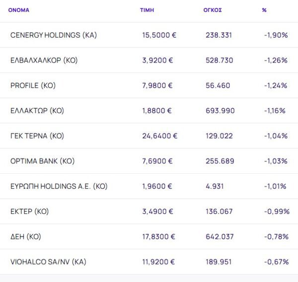 Οι μετοχές με τη μεγαλύτερη πτώση ήταν: