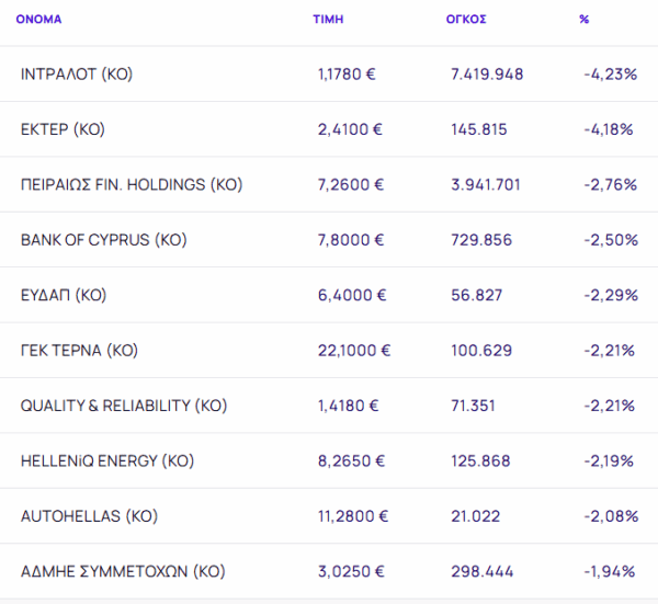 Οι μετοχές με τη μεγαλύτερη πτώση ήταν: