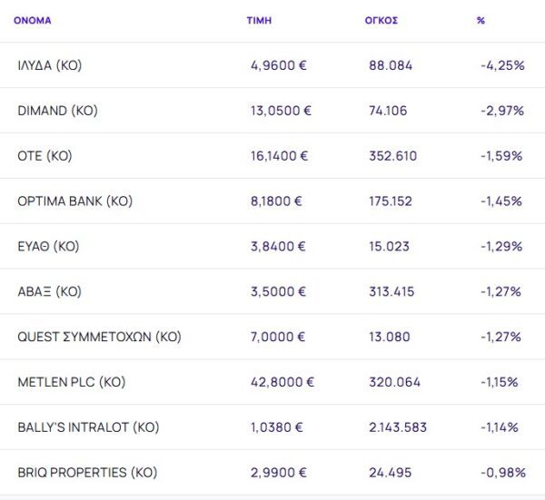Οι μετοχές με τη μεγαλύτερη πτώση ήταν: