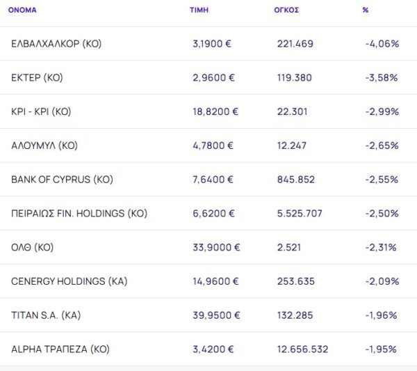 Οι μετοχές με τη μεγαλύτερη πτώση ήταν: