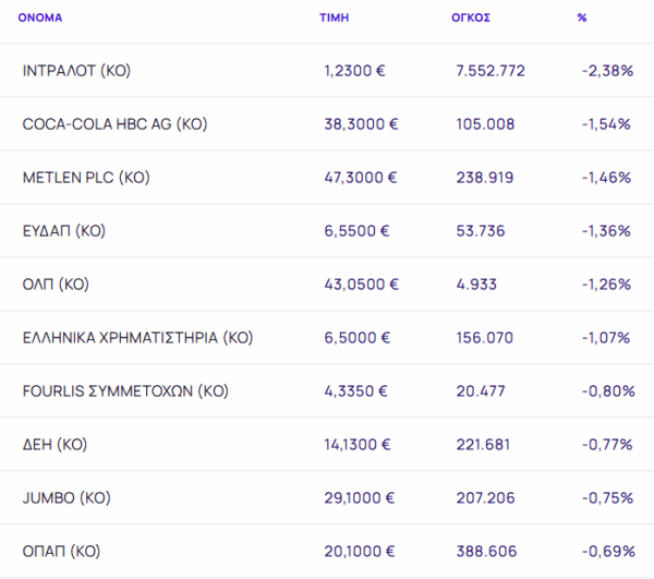 Οι μετοχές με τη μεγαλύτερη πτώση ήταν: