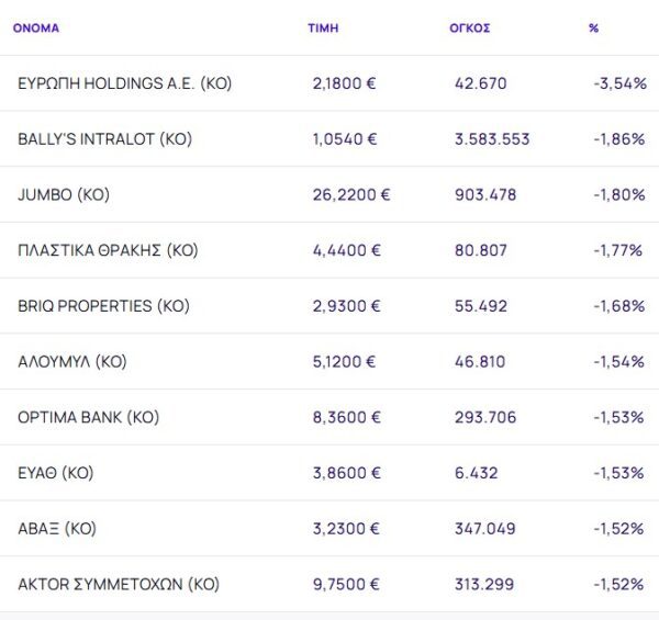 Οι μετοχές με τη μεγαλύτερη πτώση ήταν: