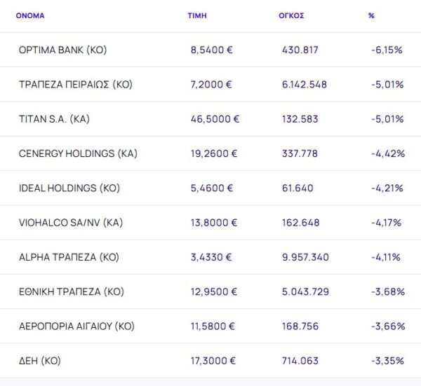 Οι μετοχές με τη μεγαλύτερη πτώση ήταν: