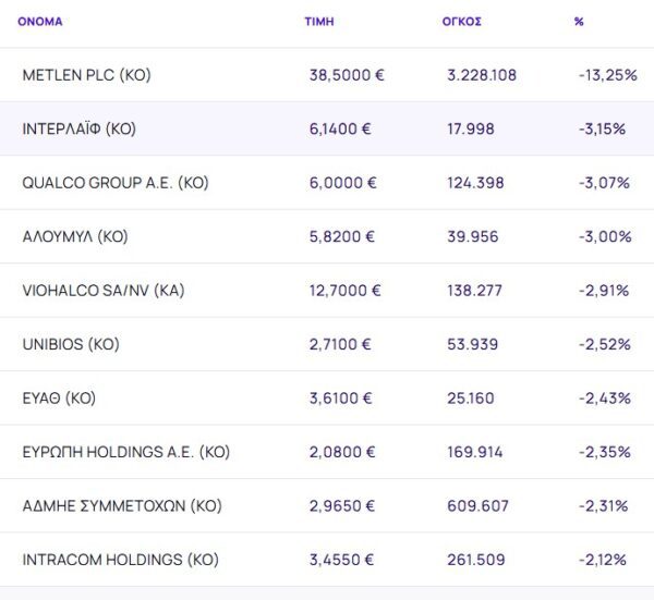 Οι μετοχές με τη μεγαλύτερη πτώση ήταν: