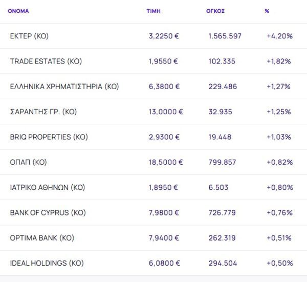 Οι μετοχές με τη μεγαλύτερη άνοδο ήταν: