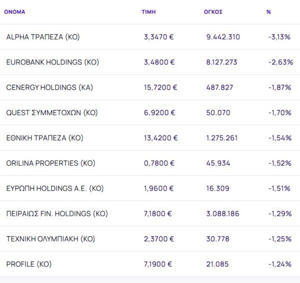 Οι μετοχές με τη μεγαλύτερη πτώση ήταν: