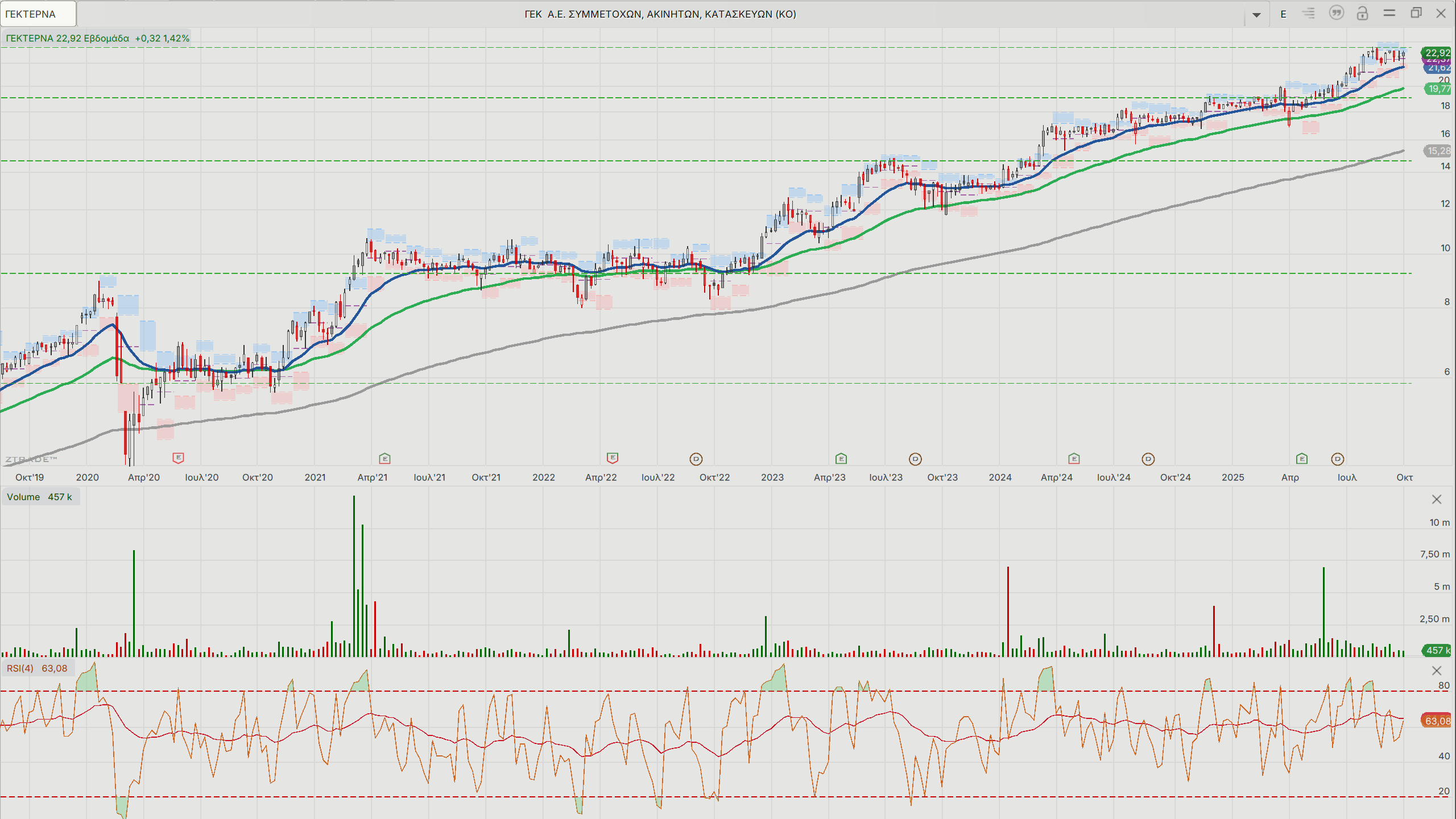 Για τη μετοχή της ΓΕΚ Τέρνα, η παραμονή της κοντά στα 22-23 ευρώ δείχνει το range που προσπαθεί να διασπάσει για να κινηθεί υψηλότερα. Ο τίτλος φαίνεται να έχει πραγματοποιήσει μια σημαντική κορυφή και αυτό παραμένει το σημείο εστίασης στο κοντινό μέλλον. Στο εβδομαδιαίο διάγραμμα, ο ταλαντωτής RSI δείχνει ότι έχει φτάσει την υπεραγορασμένη περιοχή και ίσως να χρειάζεται μια «ανάσα» στον ανοδικό δρόμο. Η ανοδική συνέχεια θα μπορούσε να φτάσει μέχρι τα 25 ευρώ, ενώ στα 19,7-20 ευρώ είναι η ζώνη άμυνας στο τρέχον ανοδικό κύμα.