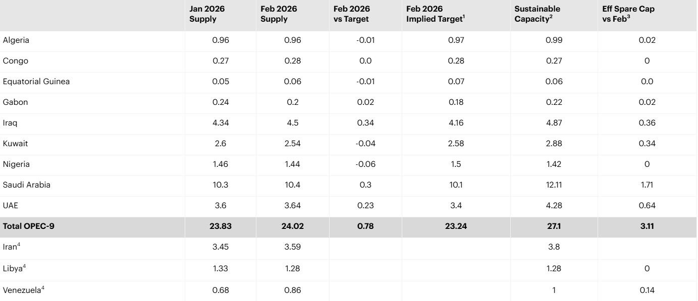 Όπως αναφέρει η ΙΕΑ, η παγκόσμια προσφορά πετρελαίου αναμένεται να μειωθεί κατά 8 εκατομμύρια βαρέλια την ημέρα τον Μάρτιο, με τις περικοπές στη Μέση Ανατολή να αντισταθμίζονται εν μέρει από την αύξηση της παραγωγής από χώρες εκτός του ΟΠΕΚ+ (όπως το Καζακστάν και η Ρωσία) μετά τις διαταραχές στην αρχή του έτους. Ενώ η έκταση των απωλειών θα εξαρτηθεί από τη διάρκεια της σύγκρουσης και των διαταραχών στις ροές, οι εκτιμήσεις δείχνουν ότι η παγκόσμια παραγωγή πετρελαίου θα αυξηθεί κατά 1,1 εκατομμύρια βαρέλια ημερησίως το 2026, με τις χώρες εκτός ΟΠΕΚ+ να καλύπτουν ολόκληρη την αύξηση.
