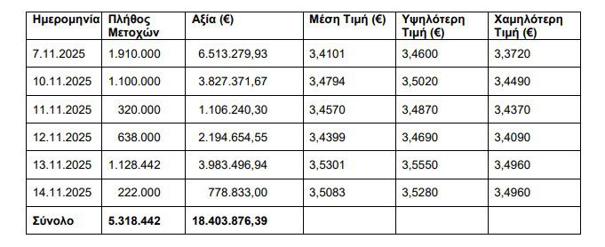 Η μεγαλύτερη ημερήσια δραστηριότητα καταγράφηκε στις 7 Νοεμβρίου 2025, όταν η τράπεζα αγόρασε 1.910.000 ίδιες μετοχές, αξίας 6.513.279,93 ευρώ, με μέση τιμή τα 3,4101 ευρώ. Ακολούθησαν οι συνεδριάσεις της 10ης και 13ης Νοεμβρίου, κατά τις οποίες αποκτήθηκαν 1.100.000 και 1.128.442 μετοχές, αντίστοιχα, με μέσες τιμές 3,4794 και 3,5301 ευρώ. Μικρότερος αριθμός τίτλων αγοράστηκε στις 11, 12 και 14 Νοεμβρίου, με τον όγκο να κυμαίνεται από 222.000 έως 638.000 μετοχές ανά συνεδρίαση.