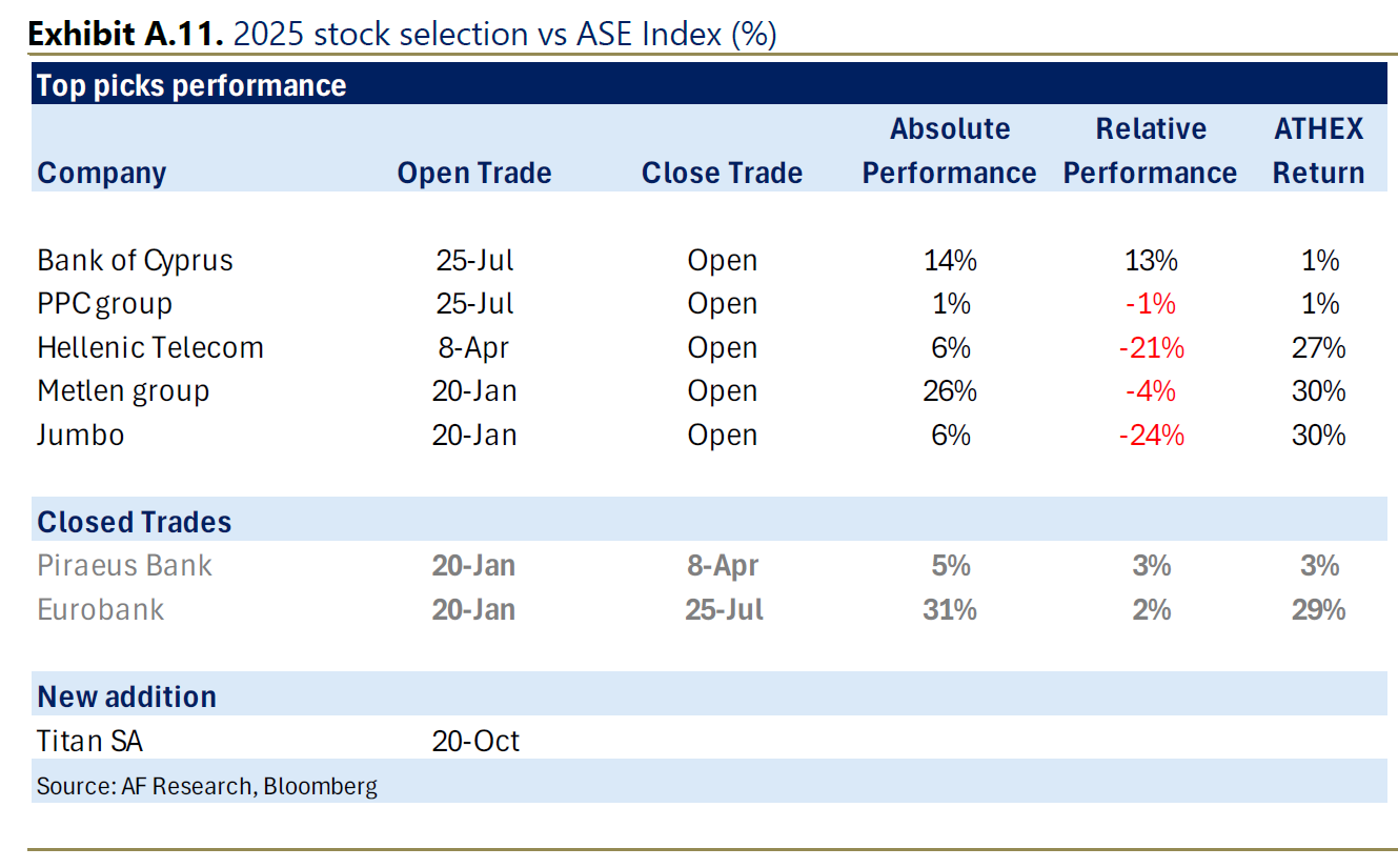 Μεταξύ των αγαπημένων μας επιλογών, προσθέτουμε την Titan Cement, εκτιμώντας ότι το επερχόμενο CMD και τα αποτελέσματα θα αντιστρέψουν την υστέρησή της, ενώ διατηρούμε τις υπάρχουσες θέσεις μας σε Metlen και Jumbo (ελκυστικές μετά τη διόρθωση), Bank of Cyprus (συνεχιζόμενη υπεραπόδοση), PPC (φιλόδοξο επενδυτικό πλάνο και ισχυρές προοπτικές ανάπτυξης) και ΟΤΕ (αμυντικό προφίλ και ισχυρός ισολογισμός). Η προτίμησή μας παραμένει υπέρ των μη τραπεζικών μετοχών, που αναμένουμε να προσφέρουν καλύτερη σχετική αξία ακόμη και σε περιόδους διόρθωσης της αγοράς.