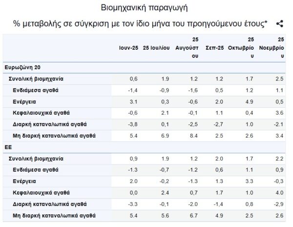 Τον Νοέμβριο του 2025, σε σύγκριση με τον Νοέμβριο του 2024, η βιομηχανική παραγωγή αυξήθηκε κατά 2,5% στη ζώνη του ευρώ και κατά 2,2% στην ΕΕ, σύμφωνα με τις πρώτες εκτιμήσεις της Eurostat.