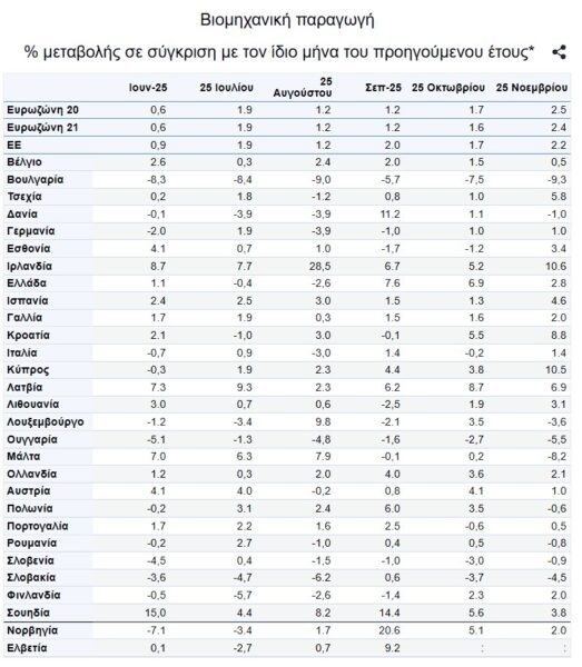 Στη ζώνη του ευρώ τον Νοέμβριο του 2025, σε σύγκριση με τον Οκτώβριο του 2025, η βιομηχανική παραγωγή