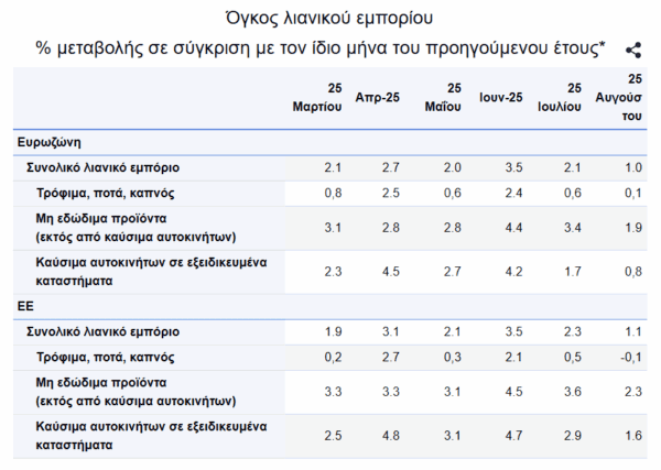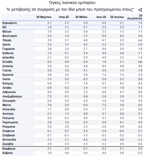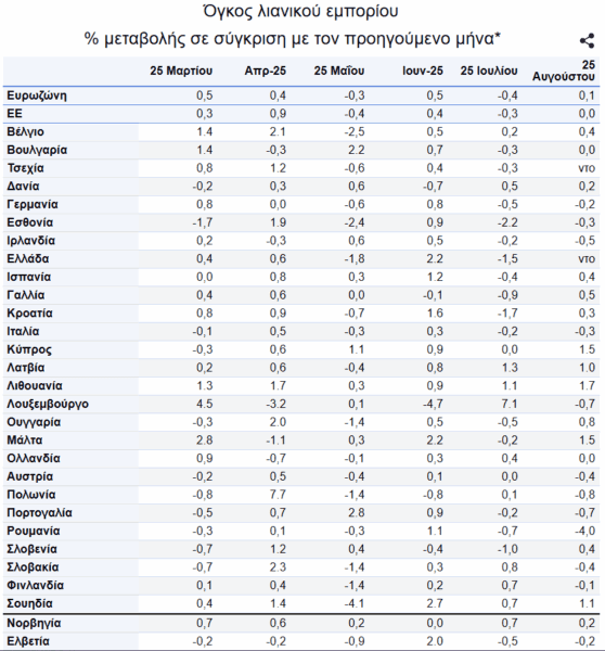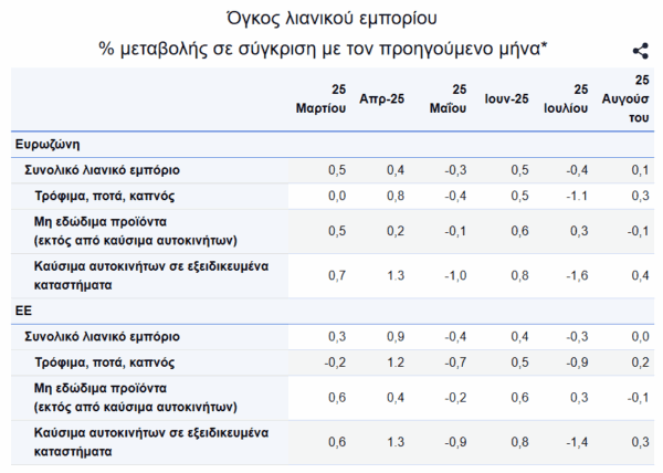 Τον Αύγουστο του 2025, σε σύγκριση με τον Ιούλιο του 2025, ο εποχικά διορθωμένος όγκος λιανικού εμπορίου αυξήθηκε κατά 0,1% στη ζώνη του ευρώ και παρέμεινε σταθερός στην ΕΕ ,ενώ τον Ιούλιο του 2025, ο όγκος λιανικού εμπορίου μειώθηκε κατά 0,4% στη ζώνη του ευρώ και κατά 0,3% στην ΕΕ .