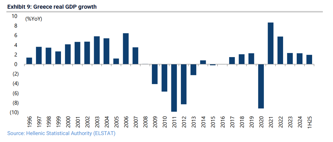 Το δημόσιο χρέος της Ελλάδας, που κορυφώθηκε στο 209,4% του ΑΕΠ το 2020, αναμένεται να μειωθεί στο 137,6% το 2026, κάτω από το ιταλικό, χάρη στα συνεχή πλεονάσματα και την αύξηση των εσόδων. Η Jefferies επισημαίνει ότι «το ελληνικό 10ετές ομόλογο διαπραγματεύεται πλέον κάτω από την Ιταλία και τη Γαλλία και αυτό είναι απολύτως λογικό». Ο δείκτης φορολογικά έσοδα προς ΑΕΠ έχει ενισχυθεί στο 28% το 2024 (από 24,5% το 2020), ενώ η οικονομία αναμένεται να αναπτυχθεί με ρυθμό 2,2% το 2025 και 2,4% το 2026.