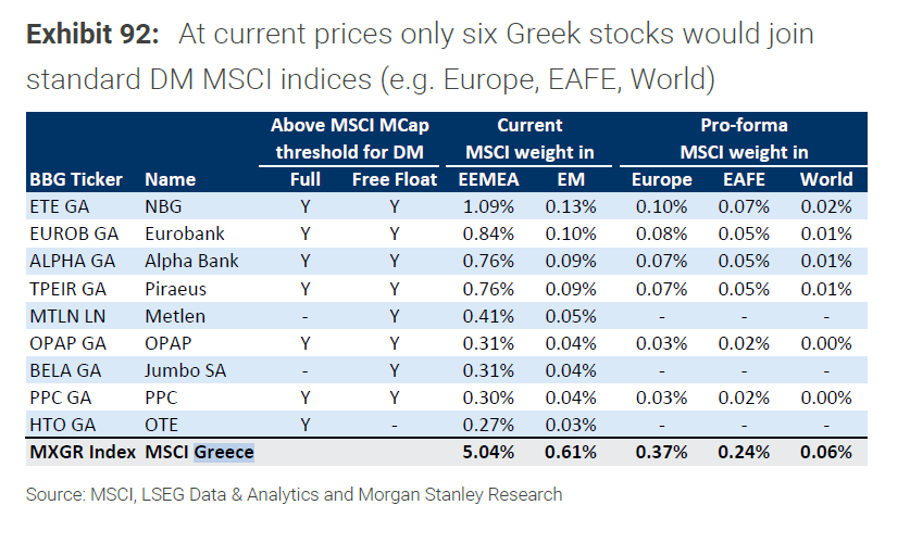 Η συνολική βαθμολογία της Ελλάδας στο country scorecard την τοποθετεί δεύτερη μεταξύ των 12 αγορών που εξετάζονται, πίσω μόνο από την Αίγυπτο. Το backtesting δείχνει ότι οι αγορές που βρίσκονται πάνω από τον μέσο όρο της περιοχής τείνουν να υπεραποδίδουν, στοιχείο που σύμφωνα με τη Morgan Stanley ενισχύει περαιτέρω την επενδυτική της θέση.