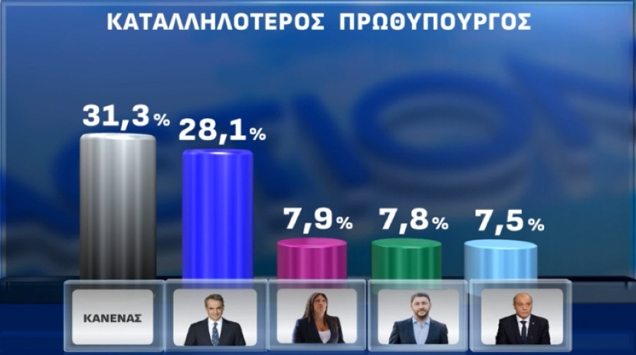 Στο ερώτημα για τον καταλληλότερο πρωθυπουργό, το 31,3% των πολιτών απαντά «κανένας», υπογραμμίζοντας τη γενικευμένη απογοήτευση από το πολιτικό προσωπικό.