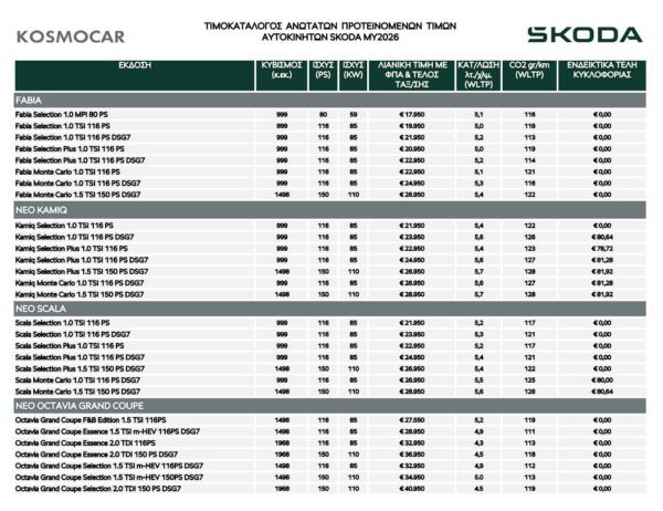 Η γκάμα των Kamiq και Scala ολοκληρώνεται με τις εκδόσεις Monte Carlo, που εκφράζουν τον πιο δυναμικό χαρακτήρα των δύο μοντέλων σε επίπεδο σχεδίασης και εξοπλισμού. Οι εκδόσεις 1.5 TSI 150 PS DSG διατίθενται πλέον με σημαντικά μειωμένη τιμή, ενώ επανέρχεται και η έκδοση 1.0 TSI 116 PS DSG, ενισχύοντας περαιτέρω τις διαθέσιμες επιλογές για το κοινό.