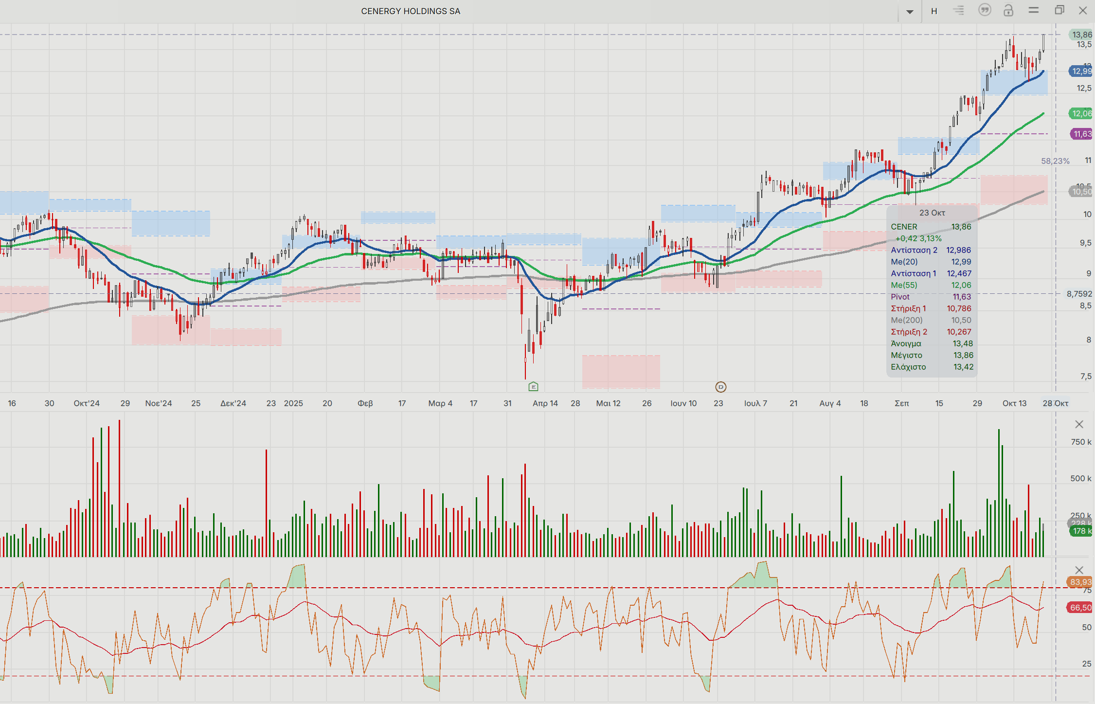 Για τη μετοχή της Cenergy Holdings, η εικόνα είναι ακόμα καλύτερη, καθώς η τιμή της μετοχής βρίσκει στήριξη στον ΕΚΜΟ 20 ημερών. Η ημερήσια τάση είναι ανοδική, με pivot point τα 11,63 ευρώ. Στήριξη στην τρέχουσα συγκυρία τα 12,99 ευρώ. O απώτερος τεχνικός στόχος για τη μετοχή είναι τα 18 ευρώ.