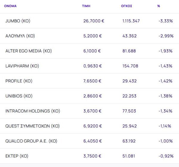 Οι μετοχές με τη μεγαλύτερη πτώση ήταν:
